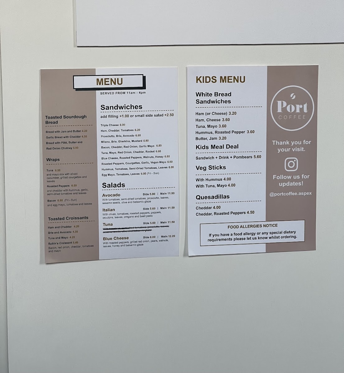 Food choices include freshly prepared sandwiches such as ham, cheddar, and tomato on sourdough bread, as well as houmous sandwiches. There are also warm options like panini and seasonal soups, for example, pumpkin soup. For lighter starters or sharable items, an antipasto selection is available.